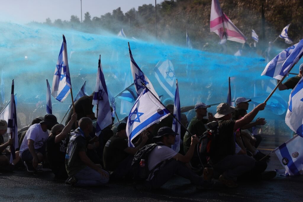 Ci-dessous, des policiers utilisent un canon à eau pour disperser les manifestants antigouvernementaux qui bloquaient l’entrée de Jérusalem lors d’une manifestation en juillet contre les réformes du système judiciaire.