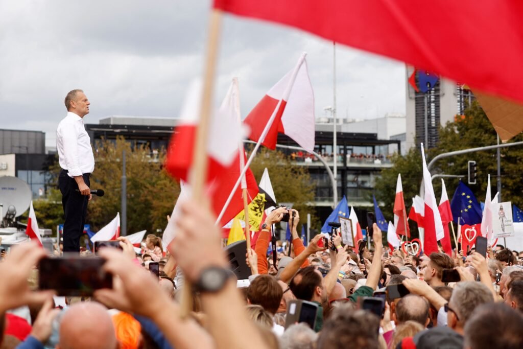 Le nouveau Premier ministre polonais Donald Tusk s’adresse aux participants à un rassemblement à Varsovie pour s’opposer au gouvernement conservateur avant les élections générales du 15 octobre.
