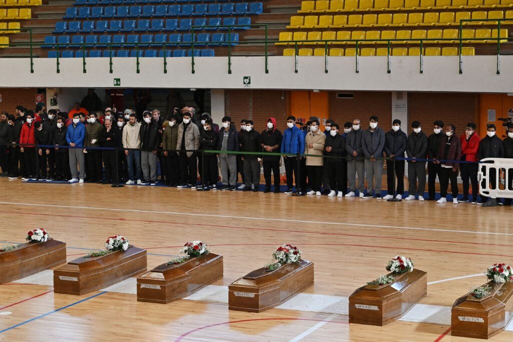 Des proches pleurent et prient près des cercueils de 65 victimes d’un naufrage dévastateur de migrants au large de la côte sud de l’Italie, disposés dans une salle de sport de Crotone.