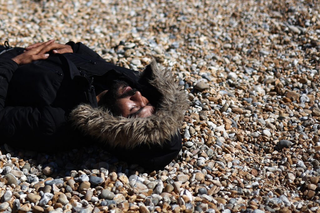 Un migrant qui a débarqué d’un canot de sauvetage après avoir été récupéré en mer alors qu’il traversait la Manche depuis la France se repose sur la plage de Dungeness, sur la côte sud-est de l’Angleterre.