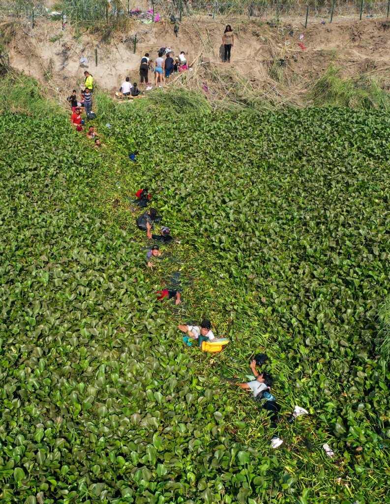 Les migrants traversent une partie du Rio Grande étouffée par les lys pour entrer aux États-Unis.