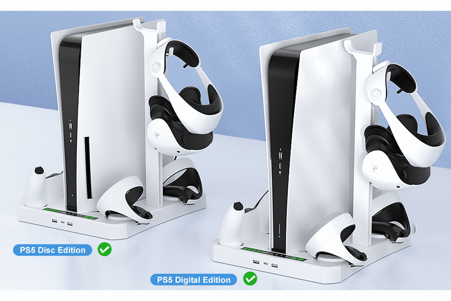 Le support Hastraith comprend un support vertical multifonctionnel qui a un compartiment pour votre PS5 ainsi que deux stations de charge magnétiques pour le contrôleur PSVR 2. Il existe également quelques ports USB, ainsi qu’une prise de type C pour connecter divers autres accessoires.