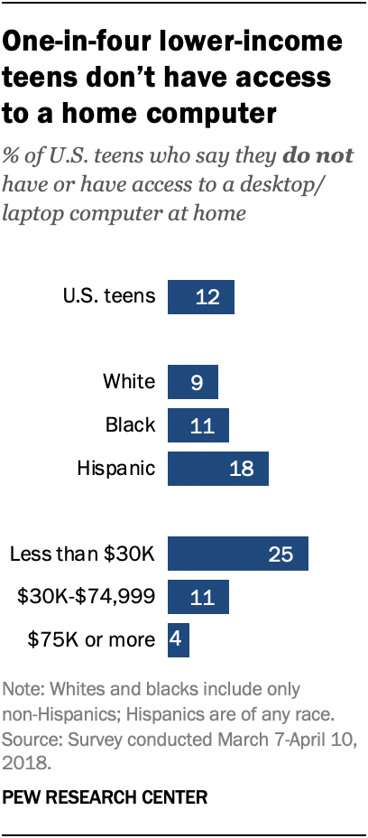 4Un quart des adolescents à faible revenu n’ont pas accès à un ordinateur personnel. Selon l’enquête de 2018, un adolescent sur quatre vivant dans des ménages dont le revenu annuel est inférieur à 30 000 dollars n’a pas accès à un ordinateur à la maison, contre seulement 4 % de ceux vivant dans des ménages gagnant plus de 75 000 dollars. Il existe également des différences selon la race et l’origine ethnique. Les adolescents hispaniques étaient particulièrement susceptibles de déclarer qu’ils n’avaient pas accès à un ordinateur personnel : 18 % ont répondu ainsi, contre 9 % des adolescents blancs et 11 % des adolescents noirs.