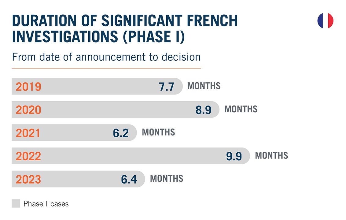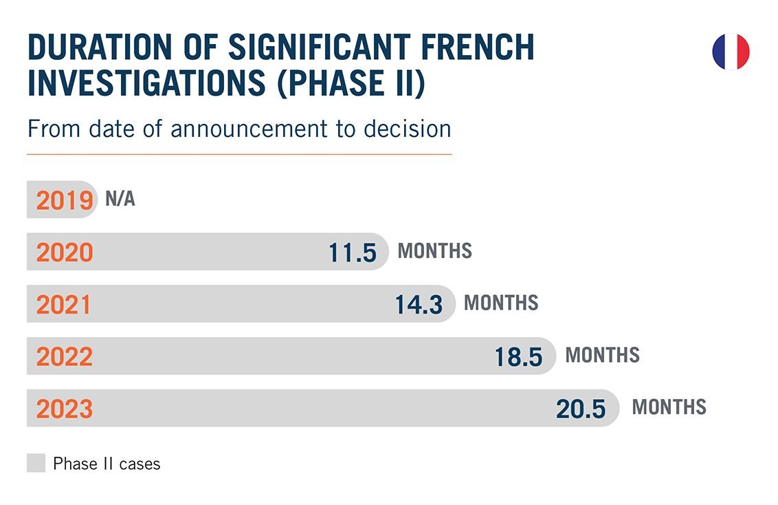 En revanche, l’année 2023 a été marquée par une durée record des examens de Phase II, qui a atteint le chiffre stupéfiant de 20,5 mois, soit une augmentation de 10,8% par rapport à 2022. L’évolution de la durée des examens de Phase II au cours des quatre dernières années révèle une augmentation annuelle moyenne. de 21,5 % en durée d’une année sur l’autre (2020-2023) – une tendance certainement préoccupante pour les parties à la fusion. Cela dit, l’attente en vaut parfois la peine : pour la deuxième année consécutive, la FCA a approuvé sans condition une transaction en Phase II (création d’une JV dans le secteur de la restauration aéroportuaire entre Aéroport de Paris et le restaurateur britannique Select Service Partner). .9 Il n’y a cependant aucune garantie de succès : les transactions Euralis/Masaidour et Smartbox/Wonderbox ont été retirées lors de la phase II après avoir fait l’objet respectivement de 21 mois et 19 mois d’enquête, au cours de laquelle les parties notifiantes n’ont pas réussi à convaincre la FCA que leurs transactions ne représentaient aucune menace. à la compétition.dix