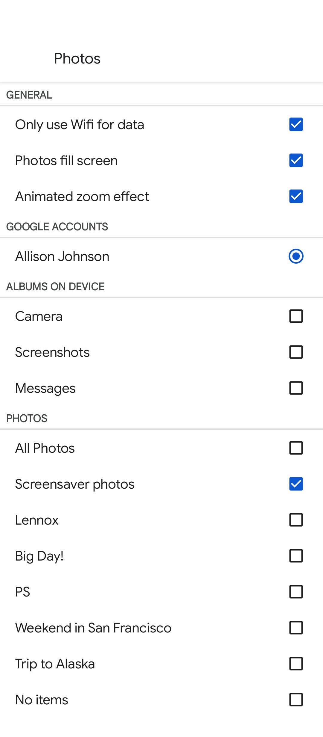 - De là, vous pouvez accéder à certaines préférences, comme activer ou désactiver l’effet de zoom animé. Pour sélectionner les photos que l’économiseur d’écran affichera, choisissez votre compte Google pour afficher une liste de vos albums Google Photos. (Vous pouvez également voir une liste des albums que vous avez sur votre appareil.) Placez une coche à côté de ceux que vous souhaitez inclure.