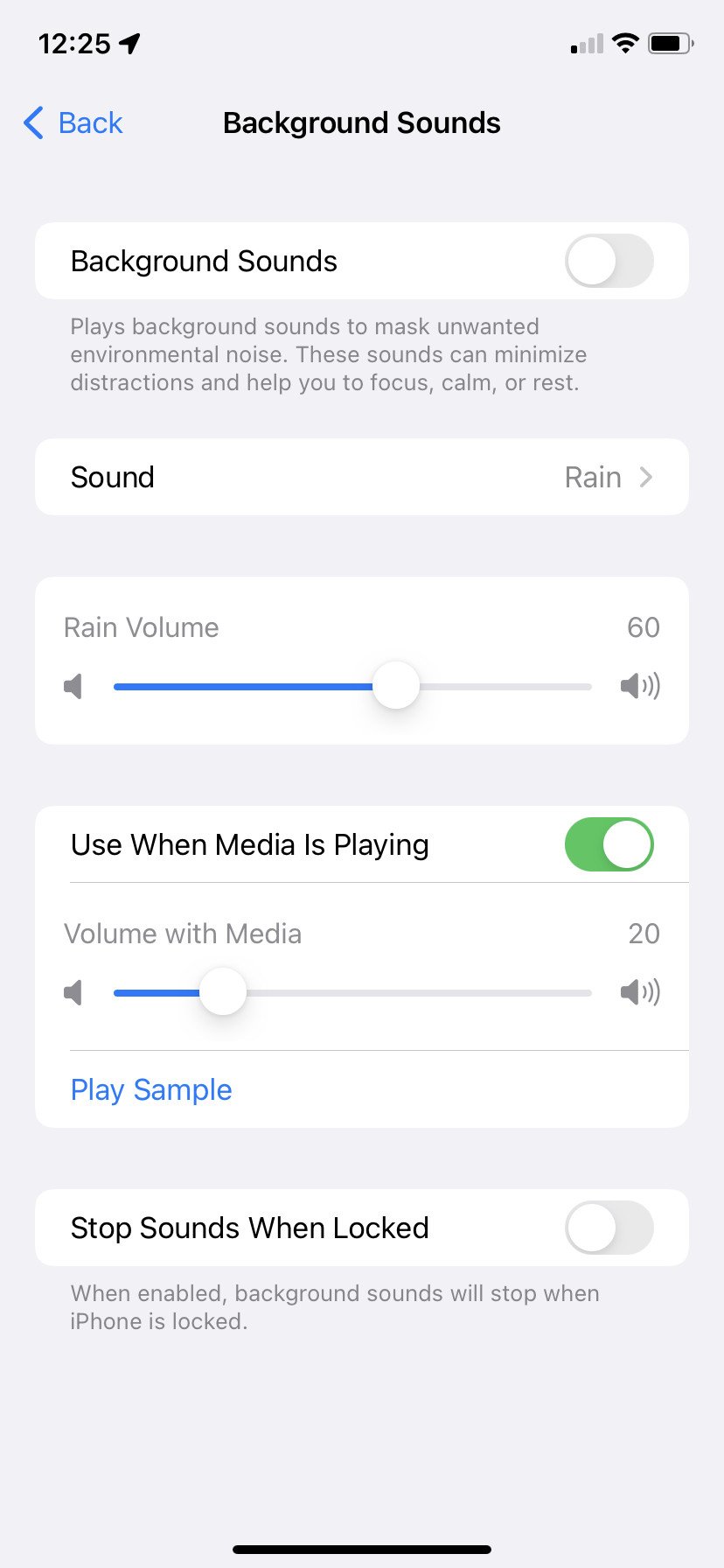 Sur la page principale du menu Fond sonore, vous pouvez également régler le volume du bruit blanc indépendamment des autres fonctions du téléphone. Il existe également des options pour activer les sons de fond lors de la lecture d’autres médias sur votre téléphone et pour que les sons cessent de jouer lorsque l’écran est verrouillé.