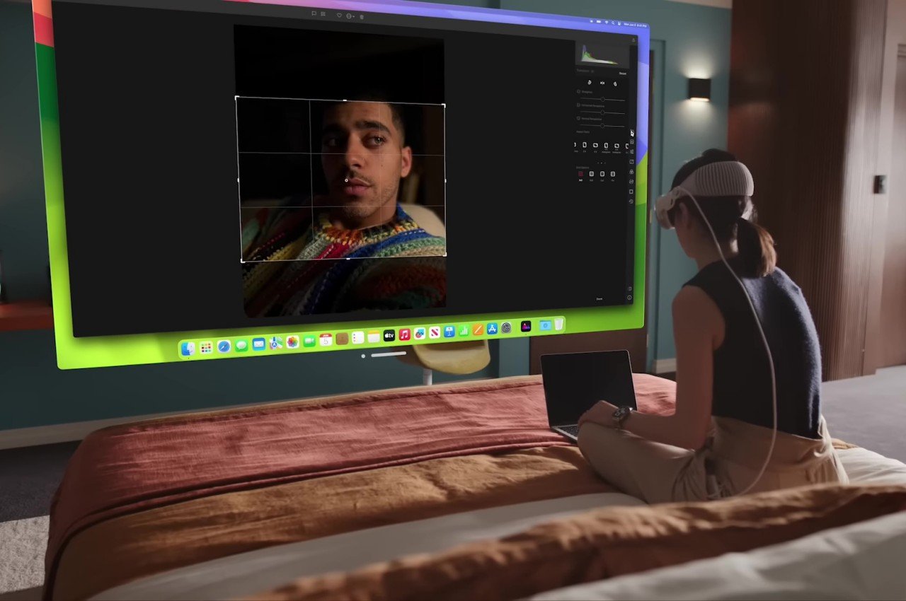 Apples visionOS Spatial Computing, cependant, est également indirectement affecté par votre environnement physique, et c’est là qu’il devient un peu magique et littéralement spatial. Selon le marketing d’Apple, vos fenêtres virtuelles projetteront des ombres sur les sols ou les murs, et elles seront également affectées par la lumière ambiante. Bien sûr, vous serez le seul à voir ces effets, mais ils rendent les fenêtres et autres objets virtuels plus réels pour vous. Le Vision Pro atténuera également son affichage pour imiter l’effet de la gradation de vos lumières lorsque vous souhaitez regarder un film dans l’obscurité. Il peut même analyser les objets environnants et leurs textures pour mélanger l’audio afin qu’il sonne comme s’il venait vraiment de toutes les directions et rebondit sur ces objets.