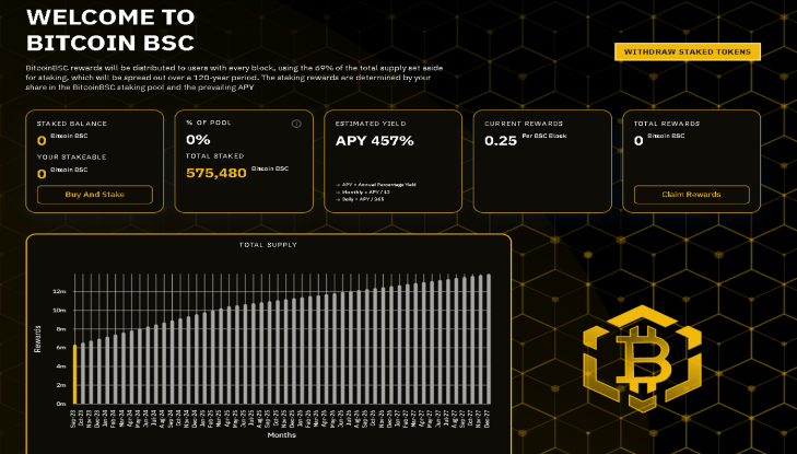 En reflétant le calendrier de sortie de Bitcoin sur 120 ans, Bitcoin BSC garantit des récompenses aux acteurs proactifs. Ces récompenses sont calculées en fonction de la part de l’individu dans le pool de mise et de l’APY répandu.