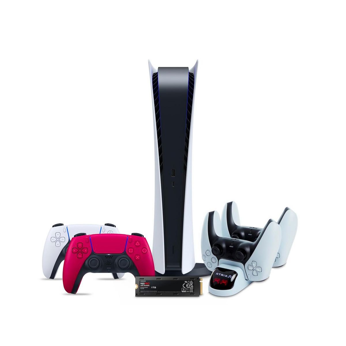 Le deuxième pack coûte 668,97 $ et comprend la PS5 Digital Edition avec un contrôleur DualSense rouge et une station de charge PowerA, mais est livré avec un SSD Samsung 1 To 980 Pro au lieu des cartes-cadeaux, ce qui vous permet de mettre à niveau la capacité de stockage de votre PS5.