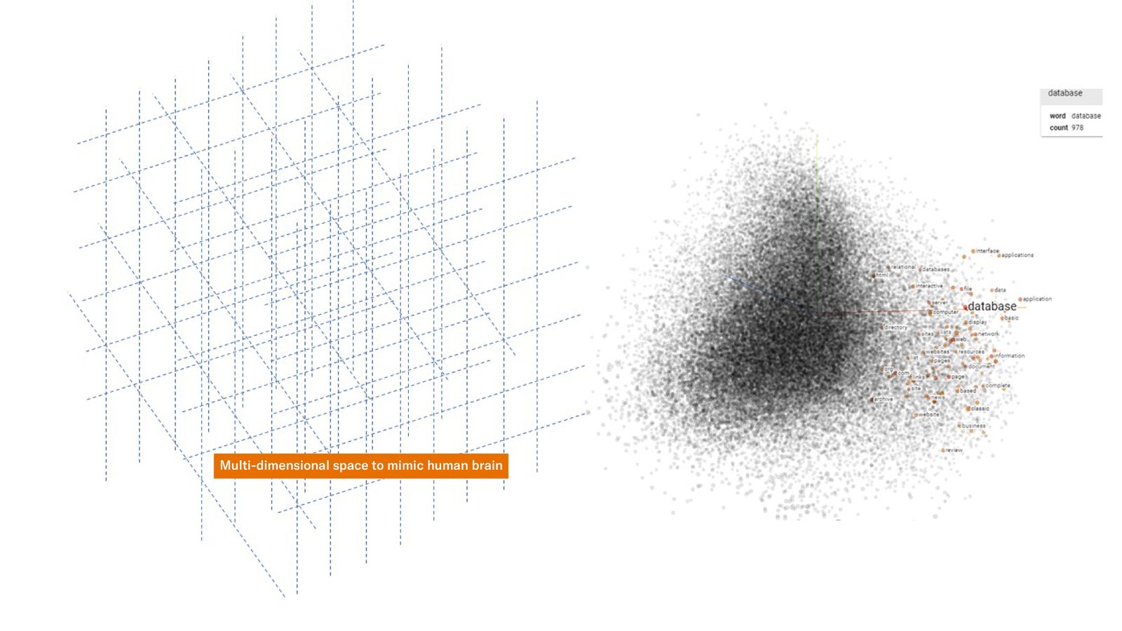 Now lets slowly expand this simple equation and think about how the human brain has neurons and synapses that work together to retrieve knowledge and make decisions. Representing the human brain would require a multi-dimensional space (called a vector) where infinite knowledge can be coded and stored for quick retrieval.