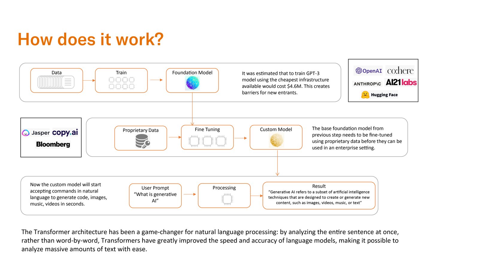 Once you have a trained model, you can ask it to generate the image of a cat flying through space in an astronaut suit and it will generate that image in seconds. For this magic to work, large clusters of GPUs and CPUs run nonstop for weeks or months to process the data the size of the entire Wikipedia website or the entire public internet to turn it into a mathematical equation where each time new data is processed, the weights and biases of the model change a little bit. Such trained models, whether large or small, are already making employees more productive and sometimes eliminating the need to hire more people.