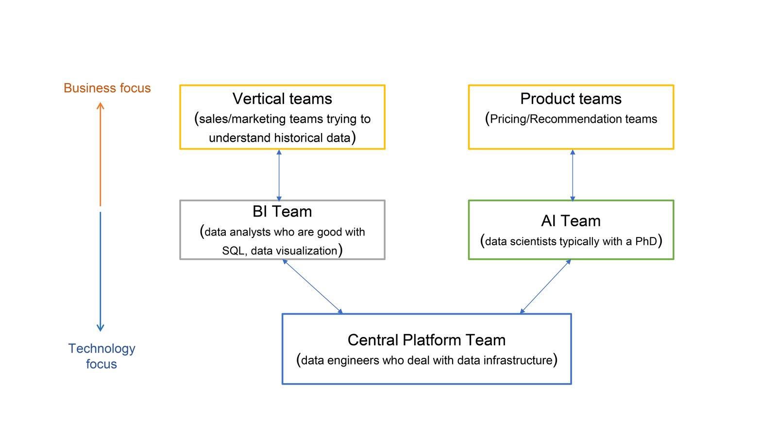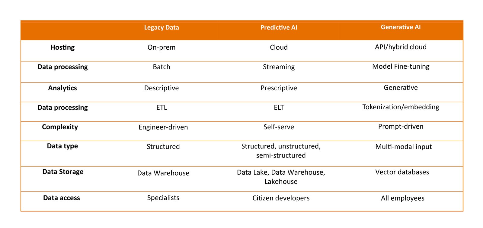Teams and skills: In talking to numerous data and AI leaders over the last few years, it became clear that team restructuring is required to manage the massive volume of data that companies deal with today. While use case-dependent to a large degree, the most efficient structure seems to be a central team that manages data which leads to both analytics and ML analytics. This structure works well not just for predictive AI but for generative AI as well.