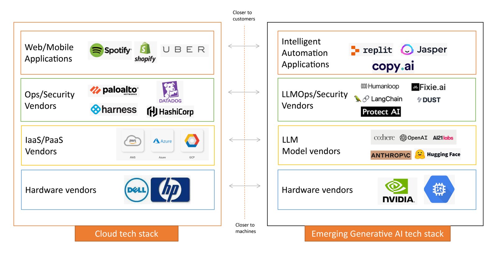 Generative AI today might be comparable to the cloud in 2008. It means a lot of innovative large companies are still to be founded. For founders, this is an enormous opportunity to create impactful products as the entire stack is currently getting built. A simple comparison can be seen below: