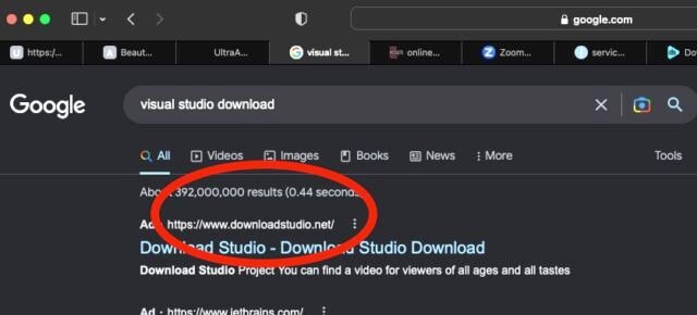 Il n’est pas difficile de trouver des preuves anecdotiques que la publicité malveillante de Google est hors de contrôle. Les recherches à la recherche de téléchargements de logiciels sont probablement les plus susceptibles de générer des publicités malveillantes. Prenez, par exemple, les résultats renvoyés par Google pour une recherche jeudi à la recherche d’un téléchargement de visual studio :