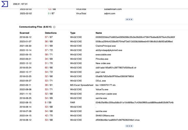 L’adresse IP qui hébergeait le site, 208.91.197[.]91, a été signalé par cinq moteurs distincts :