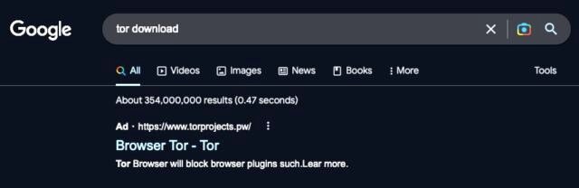 La recherche sur Google du navigateur d’anonymat Tor n’a pas été meilleure. En cliquant sur l’annonce Google renvoyée pour le téléchargement de Tor dirigé vers le domaine torprojects[.]pw.
