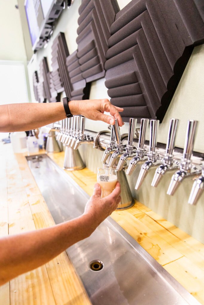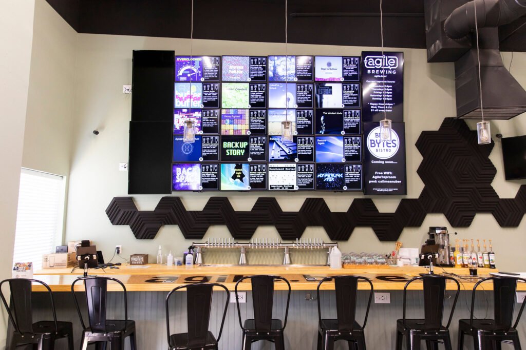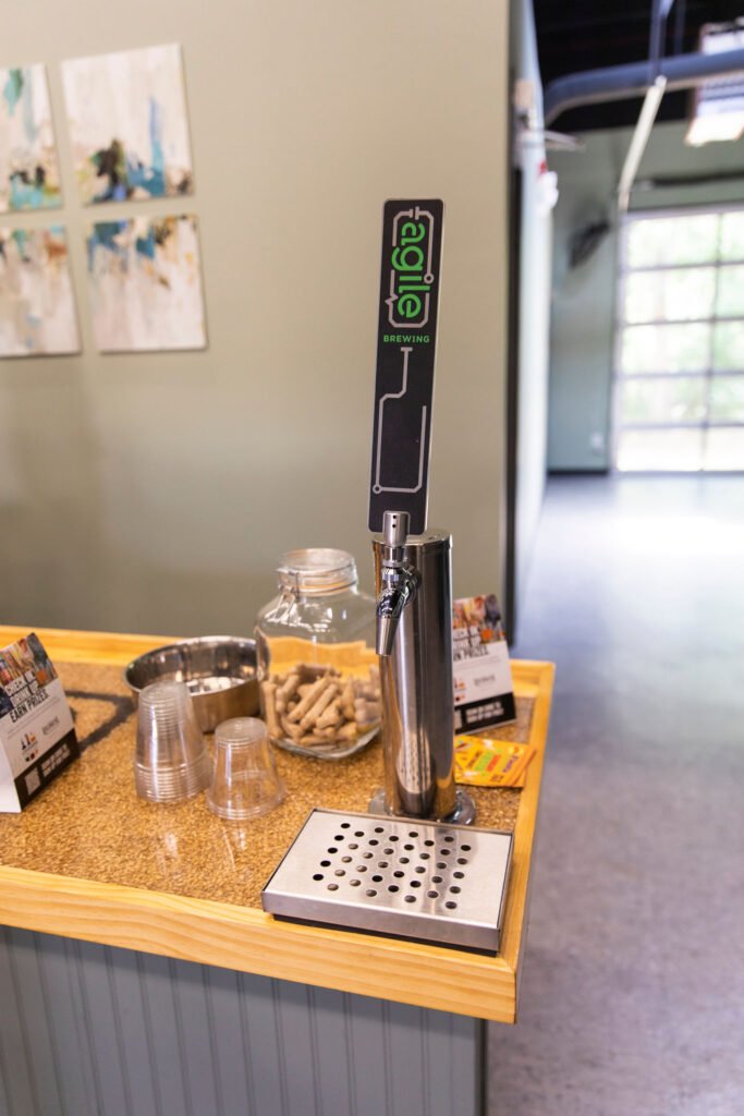 Le bar est orné des grains réels que Primeaux utilise pour brasser, avec des grains plus foncés illustrant le logo Agile Brewing. L’installation est simple mais satisfaisante.