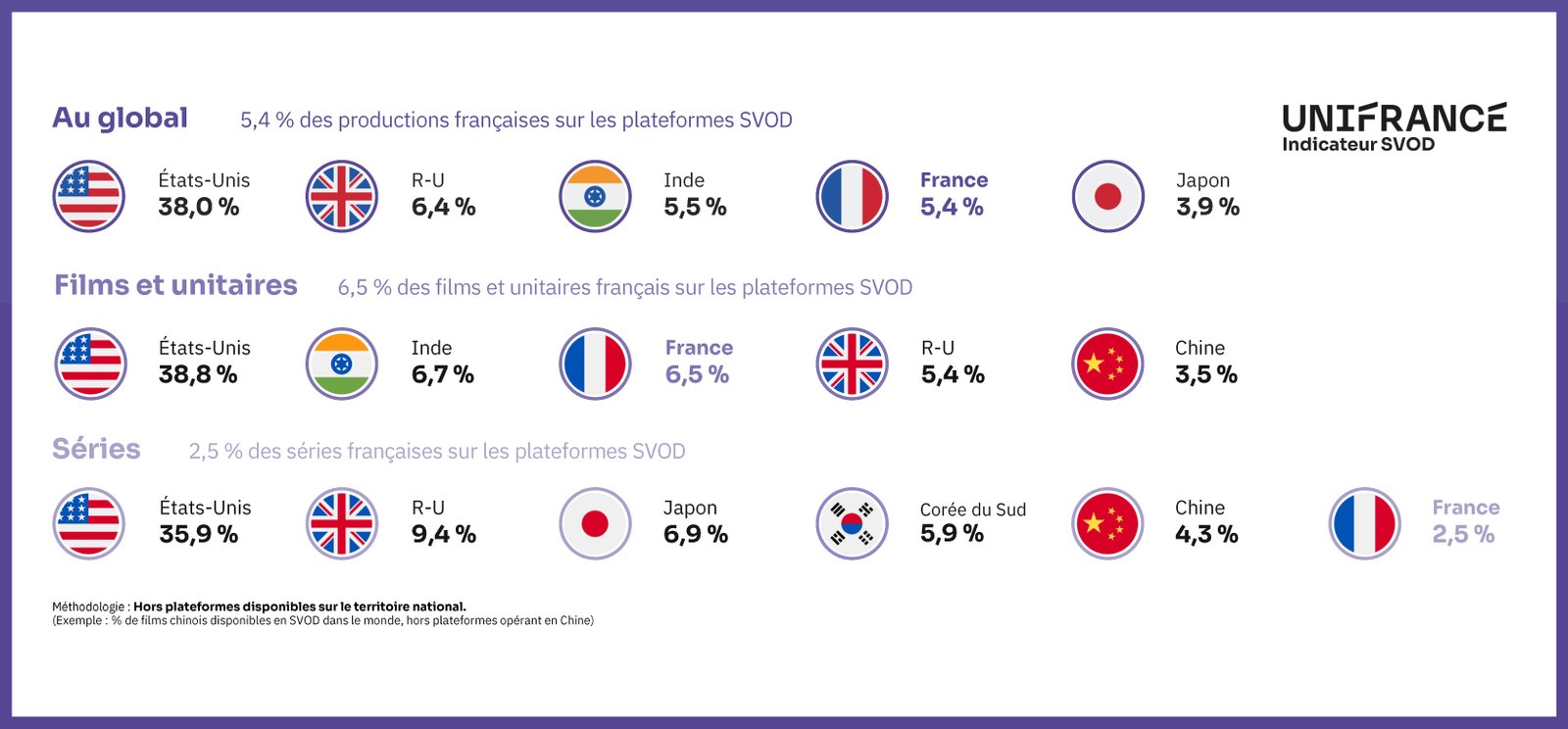 Ainsi, Les productions françaises représentaient 5,4% du catalogue des plateformes de SVOD dans le monde en juillet 2022, hors France. Au total, plus de 6 700 œuvres françaises distinctes sont présentes sur les plateformes de SVOD dans le monde.