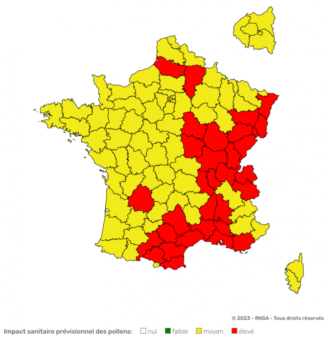 Il a un impact sanitaire accru dans 31 départements situés principalement dans l’est ou le sud de la France, selon le dernier carte des risques par le Réseau national de surveillance arbiologique (RNSA).