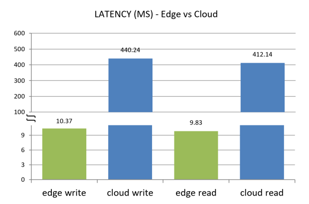 Pour les lectures et les écritures, les résultats ont montré que l’architecture Edge réduisait la latence de 98 % par rapport à l’architecture cloud :
