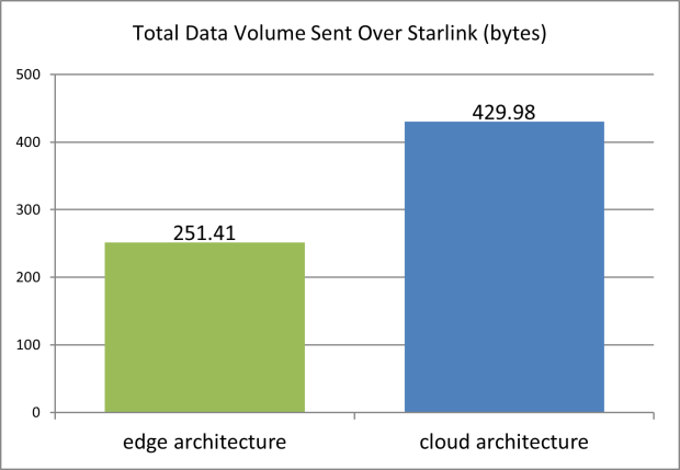 En comparant l’architecture de périphérie et l’architecture cloud pour l’utilisation de la bande passante, les résultats ont montré que le volume total de données envoyé via Starlink avait considérablement diminué sur l’architecture de périphérie.