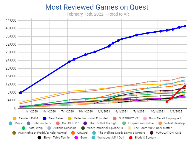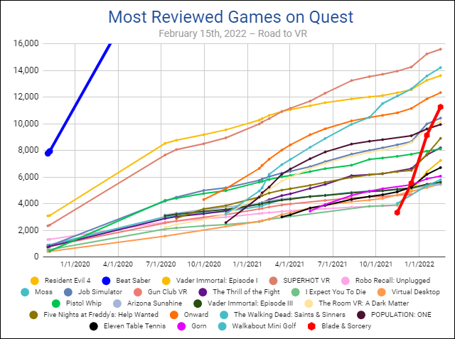 La comparaison de son ascension côte à côte avec les autres applications les plus examinées sur le casque montre à quelle vitesse il a dépassé d’autres jeux en nombre d’examens (ce qui est un indicateur relatif fort des ventes unitaires). Son rythme montre peu de signes de ralentissement, et il sembleNomade devrait continuer à dépasser d’autres titres dans un proche avenir.