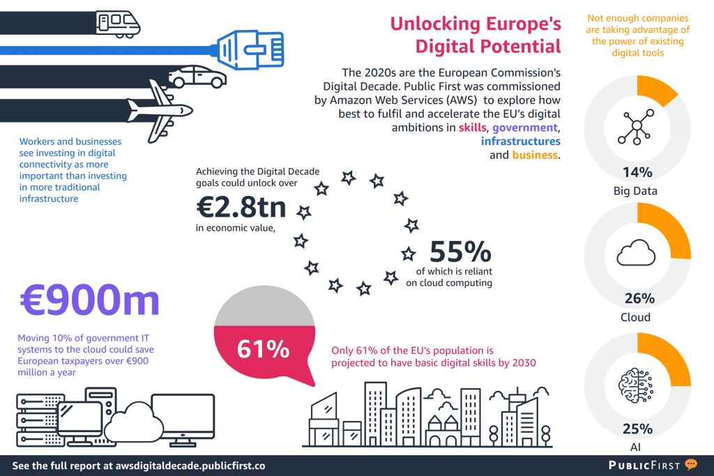 En examinant plus en profondeur les objectifs présentés par la Commission européenne, une étude récente de Public First, commandée par Amazon Web Services (AWS), a révélé que la décennie numérique pourrait débloquer plus de 2,8 billions de valeur économique équivalant à 21 % de l’économie actuelle de l’UE via une concentration soutenue et collective sur la transformation numérique dans les secteurs public et privé.