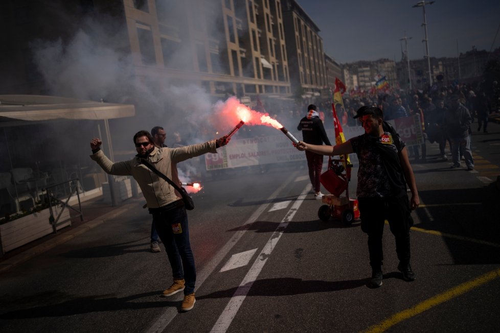 Des manifestants allument des fusées éclairantes lors d’une manifestation à Marseille, dans le sud de la France, le mercredi 15 mars 2023. Les opposants au régime de retraite du président français Emmanuel Macron organisent une nouvelle série de grèves et de manifestations alors qu’un comité mixte de sénateurs et de législateurs de la chambre basse examine la contestation facture. (AP Photo/Daniel Cole)