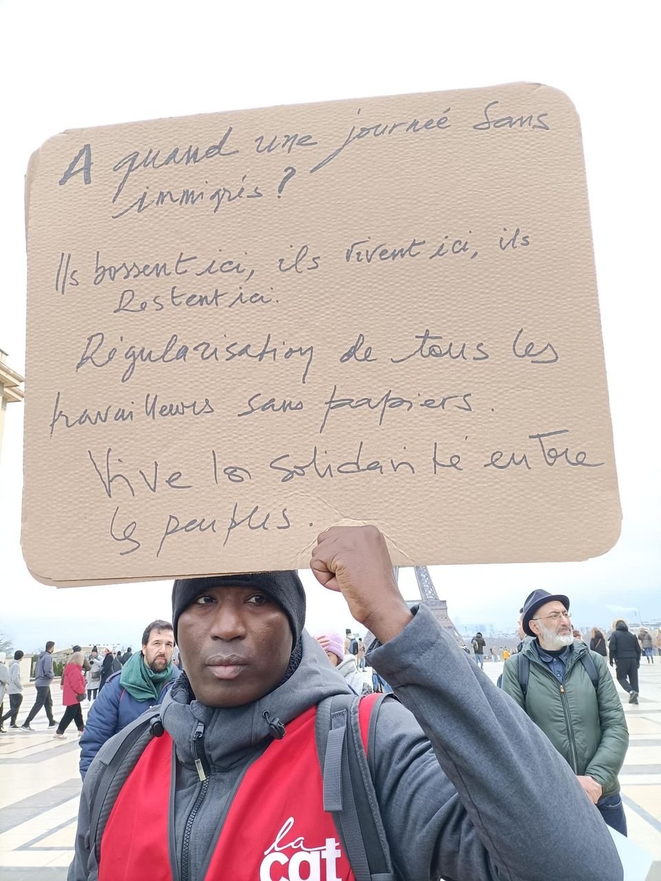 Adama a critiqué la tromperie politique de Macron, qui s’est engagé à s’opposer à l’extrême droite pour ensuite adopter une loi fasciste contre l’immigration. Il a dit : Mais pour satisfaire l’extrême droite, pour satisfaire les racistes, ceux qui veulent à tout prix accéder au pouvoir dénoncent chaque jour les immigrés, même ceux qui travaillent et ne vivent pas des aides (de l’État). Je me réveille à 4 heures du matin pour travailler. Je participe à la vie économique du pays, et je suis lié à la France par l’histoire.