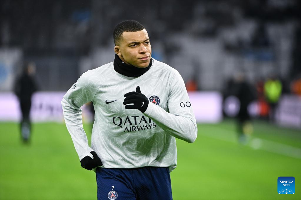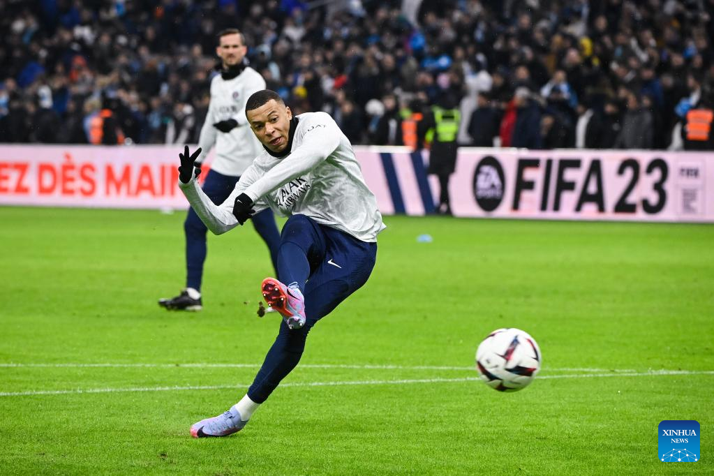 Kylian Mbappe du Paris Saint-Germain (PSG) s’échauffe avant un match de football de Ligue 1 entre l’Olympique de Marseille (OM) et le Paris Saint-Germain (PSG) au stade Vélodrome de Marseille, France, le 26 février 2023. (Photo de Clément Mahoudeau/Xinhua)