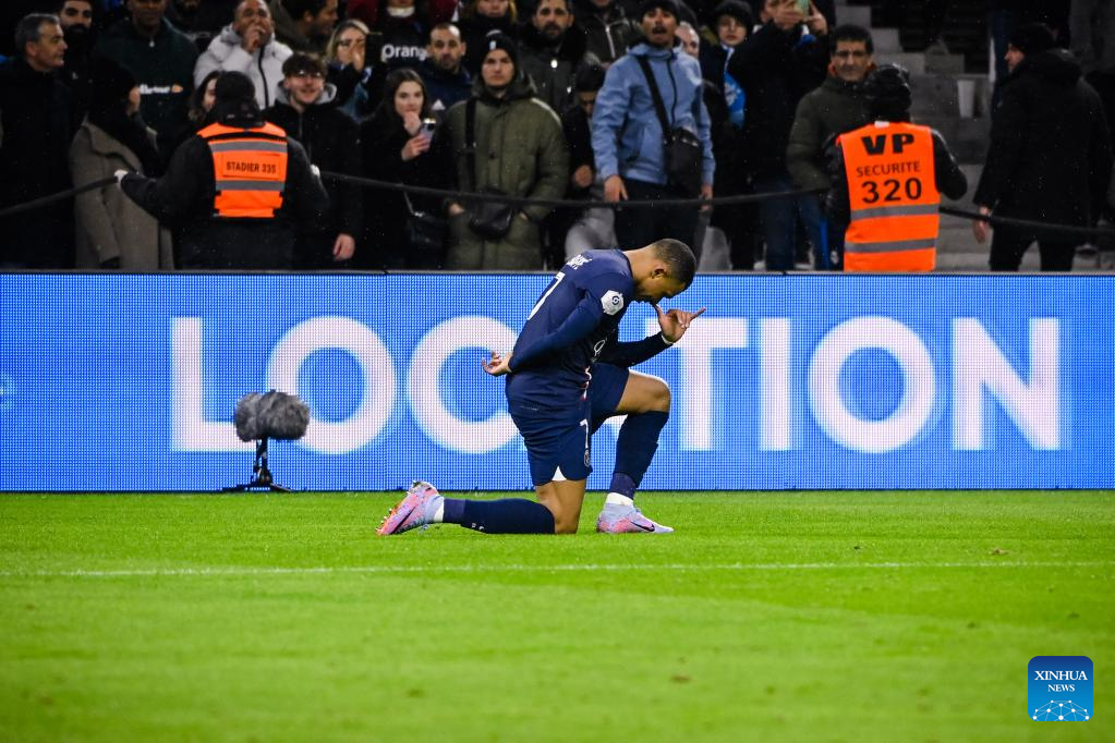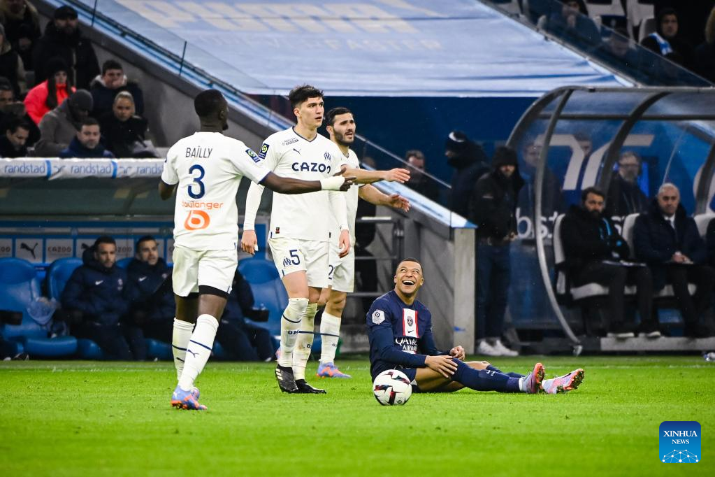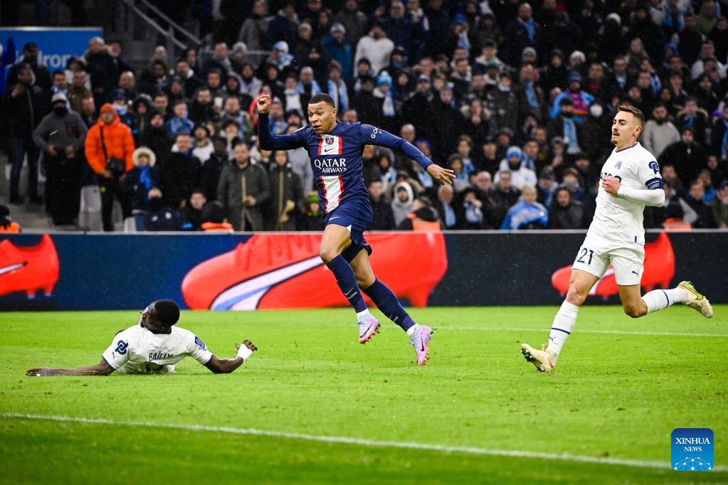 Kylian Mbappe (1er R) du Paris Saint-Germain (PSG) réagit lors d’un match de football de Ligue 1 entre l’Olympique de Marseille (OM) et le Paris Saint-Germain (PSG) au stade Vélodrome de Marseille, France, le 26 février. , 2023. (Photo Clément Mahoudeau/Xinhua)