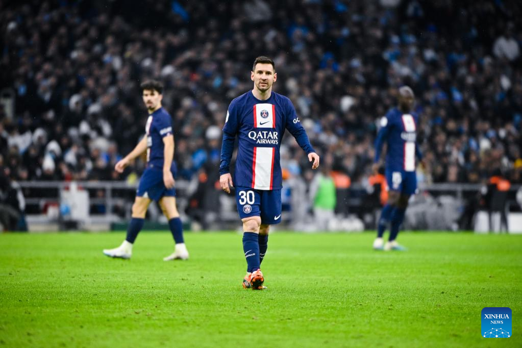 Lionel Messi (C) du Paris Saint-Germain (PSG) réagit lors d’un match de football de Ligue 1 entre l’Olympique de Marseille (OM) et le Paris Saint-Germain (PSG) au stade Vélodrome de Marseille, France, le 26 février 2023. (Photo de Clément Mahoudeau/Xinhua)