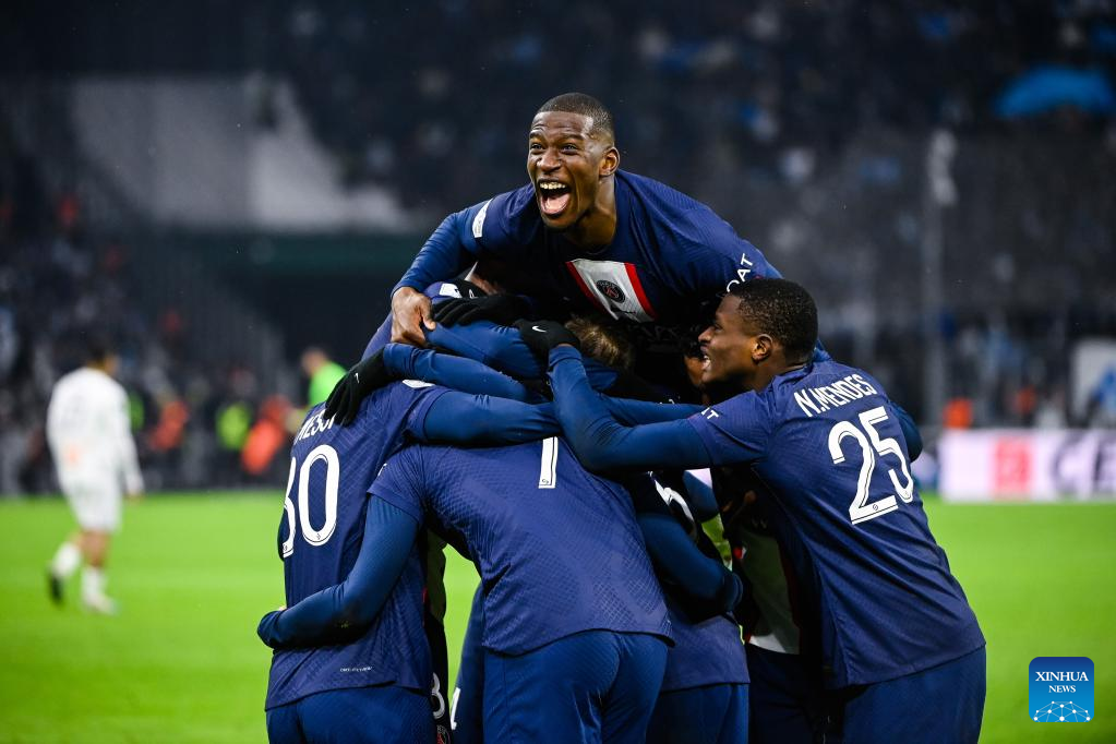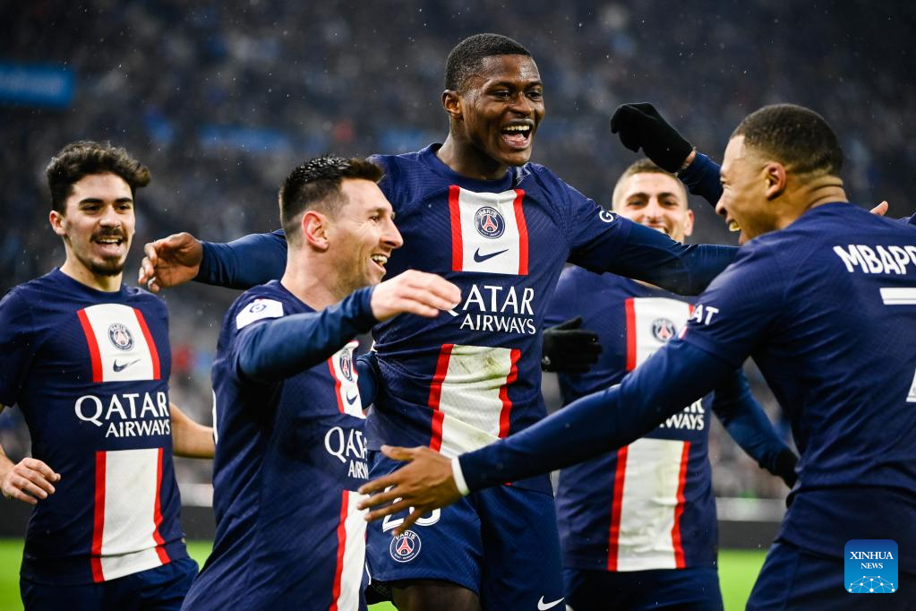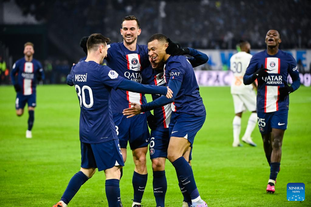 Les joueurs du Paris Saint-Germain (PSG) célèbrent le deuxième but de Kylian Mbappe lors d’un match de football de Ligue 1 entre l’Olympique de Marseille (OM) et le Paris Saint-Germain (PSG) au stade Vélodrome de Marseille, France, le 26 février. 2023. (Photo de Clément Mahoudeau/Xinhua)