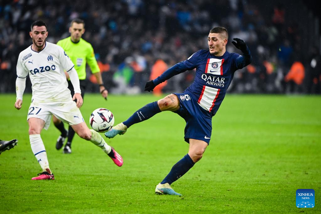Marco Verratti (R) du Paris Saint-Germain (PSG) participe à un match de football de Ligue 1 entre l’Olympique de Marseille (OM) et le Paris Saint-Germain (PSG) au stade Vélodrome de Marseille, France, le 26 février 2023. (Photo de Clément Mahoudeau/Xinhua)