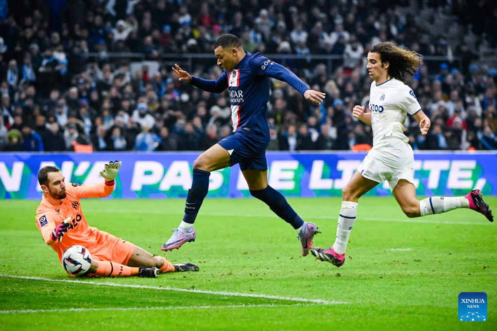 Kylian Mbappe (C) du Paris Saint-Germain (PSG) tire le ballon lors d’un match de football de la Ligue 1 entre l’Olympique de Marseille (OM) et le Paris Saint-Germain (PSG) au stade Vélodrome de Marseille, France, le 2 février 2020. 26, 2023. (Photo de Clément Mahoudeau/Xinhua)