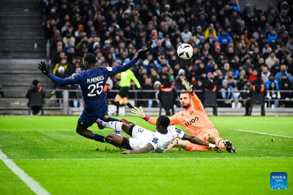 Paul Lopez (R) de l’Olympique de Marseille (OM) tente de sauver un but lors d’un match de football de Ligue 1 entre l’Olympique de Marseille (OM) et le Paris Saint-Germain (PSG) au stade Vélodrome de Marseille, en France, le 2 février 26. 2023. (Photo de Clément Mahoudeau/Xinhua)