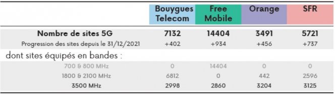 Pour simplifier, pour que les performances de la 5G soient optimales, il est préférable que les sites soient équipés des trois bandes de fréquences. Le tableau ci-dessus montre les progrès de chaque opérateur à cet égard.