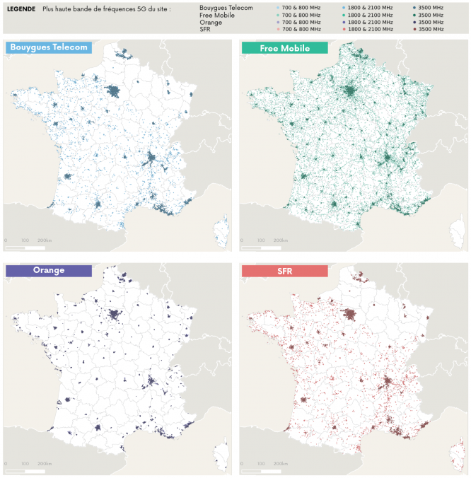 Les cartes ci-dessous montrent les sites où la 5G a été commercialement déployée par chacun des quatre opérateurs.