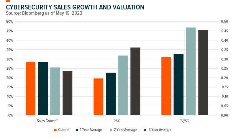La cybersécurité en tant que panier a affiché une forte croissance des ventes qui reste supérieure au taux de croissance moyen enregistré au cours des dernières années. Du point de vue de la valorisation, le ratio PSG, qui mesure le prix aux ventes par unité de la croissance consensuelle des ventes sur 12 mois, s’est récemment établi à 0,20x contre une moyenne sur deux ans de 0,32x. De plus, le ratio de croissance EV/ventes, qui tient compte de l’effet de levier, est actuellement évalué à 0,31x contre sa moyenne sur deux ans de 0,47x.15
