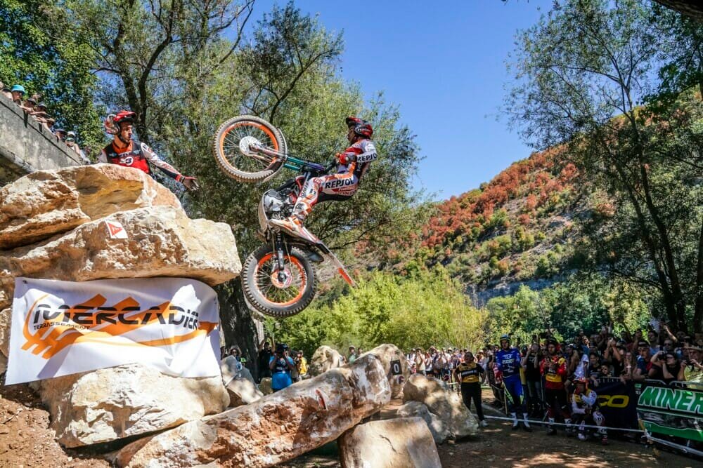 Toni Bou (Repsol Honda) a de nouveau triomphé au TrialGP de France. Organisées à Cahors par une journée étouffante, les cinq premières sections ont été tracées dans une carrière où les concurrents se sont affrontés sur des talus escarpés et lâches parsemés de marches rocheuses décourageantes. De là, c’était jusqu’aux rives d’une rivière voisine et une série de sections massives et artificielles comprenant d’énormes marches rocheuses et encore des talus escarpés à couper le souffle.