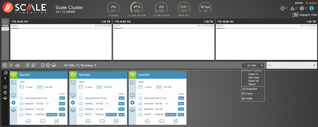 Changing the view from RAM to DISK on the top section of the management window will change the display in that section. There is also an option to perform functions across all nodes in the cluster simultaneously by clicking the ALL VMs detail and selecting the action from the drop-down menu.