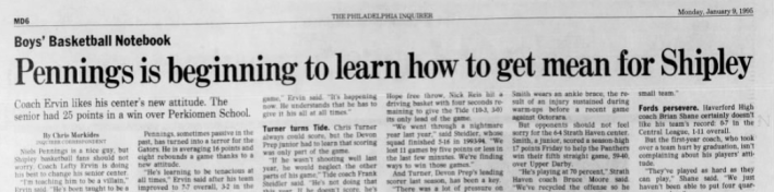 The infamous shot attempt happened just before halftime, during a game between Shipley and the Delaware County Christian School. From what I can tell based on box scores from old copies of The Philadelphia Inquirer, the gamethe last one of the regular seasonhappened on Friday, Feb. 10, 1995, and Penningss shot would not have changed the game much. The teams entered halftime with DelCo Christian leading 52-40. The Shipley Gators eventually lost, 95-86.