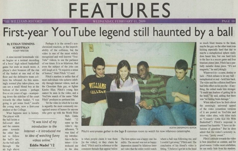 His celebrity status even merited a write-up in the school paper, The Williams Record. In a February 2009 feature article headlined First-year YouTube legend still haunted by a ball, Piltch was compared to contemporaries such as Chocolate Rain singer Tay Zonday and the MMA fighter Kimbo Slice. Piltch admitted at the time that the notoriety among his classmates was pretty sweet. Some of the details in our conversation are already present in this old articleclearly, he is practiced in talking about his claim to fame.