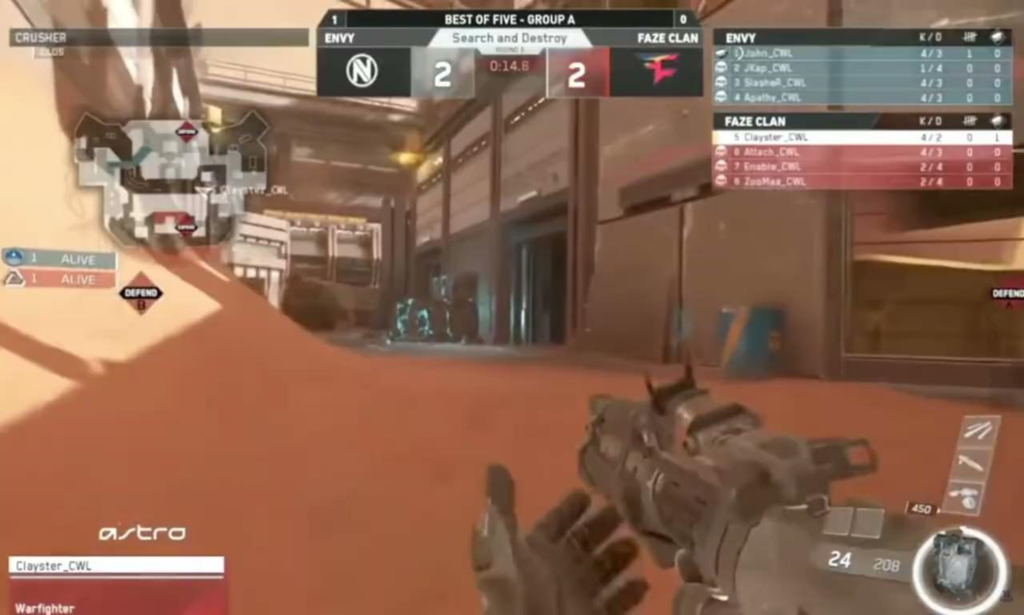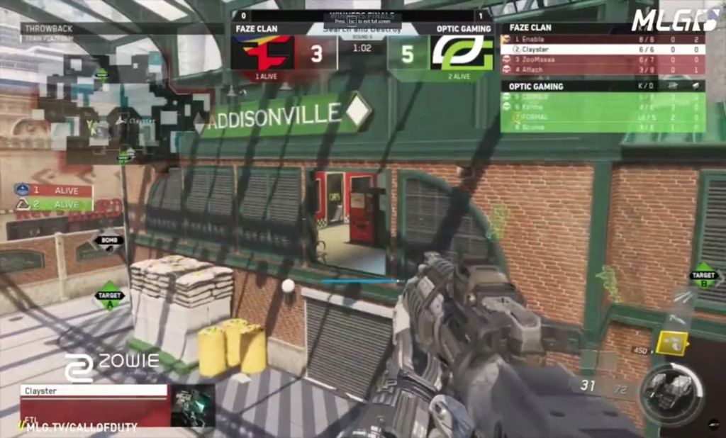 Au cours d’une Guerre infinie map de Search and Destroy sur Crusher, Clayster était dans un 1 contre 1 contre Jonathan John Perez. Clayster savait où John se dirigeait, courant derrière lui pendant plusieurs secondes dans le site de la bombe B. Alors que John plantait, Clayster a commencé à lui tirer dessus, ce qui aurait dû être une mise à mort facile.