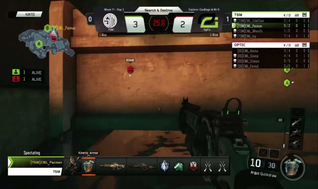 Cela a été parfaitement illustré lors de la Black Ops 3 saison dans un match entre OpTic Gaming et TSM. Damon Karma Barlow et Jonathan « Pacman » Tucker étaient dans un 1 contre 1 sur Hunted Search and Destroy. Karma a été forcé de poser la bombe, mais alors qu’il allait le faire, Pacman s’est mis derrière lui. À l’aide d’un fusil de chasse peu orthodoxe, l’Argus, Pacman s’est installé directement derrière Karma afin qu’il puisse lui tirer dessus une fois qu’il avait fini de poser la bombe.