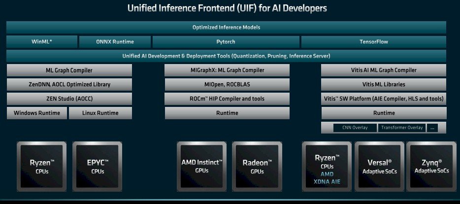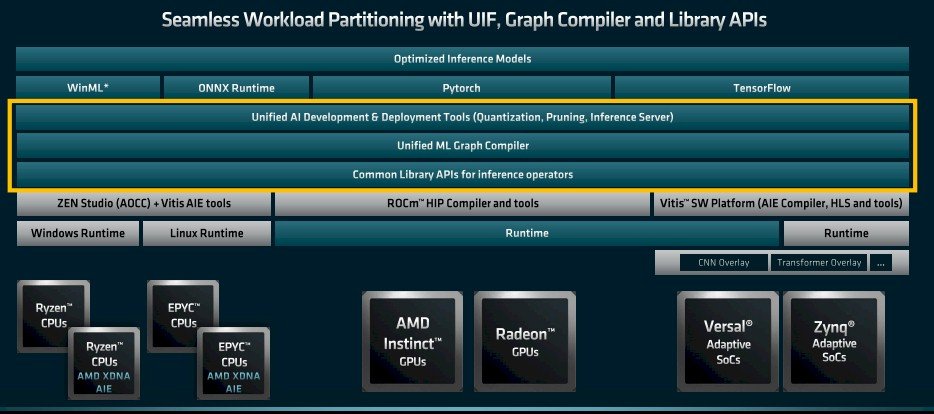 Mais à long terme, avec Unified AI Stack 2.0, les compilateurs de graphes ML sont unifiés et un ensemble commun de bibliothèques couvre tous ces appareils ; de plus, certains des blocs AI Engine DSP qui sont codés en dur dans les FPGA Versal seront déplacés vers les processeurs et les compilateurs Zen Studio AOCC et Vitis AI Engine seront mélangés pour créer des runtimes pour les systèmes d’exploitation Windows et Linux pour les APU qui ajoutent l’IA Moteurs d’inférence pour les processeurs Epyc et Ryzen.